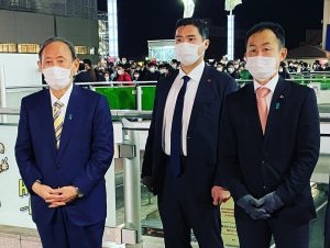 選挙中は、菅義偉前総理が桜田先生の同期と言うことで自ら応援に駆けつけてくれ、私は桜田先生に何かあった時のための付き添いとして菅総理と並んで観衆の前にいました。